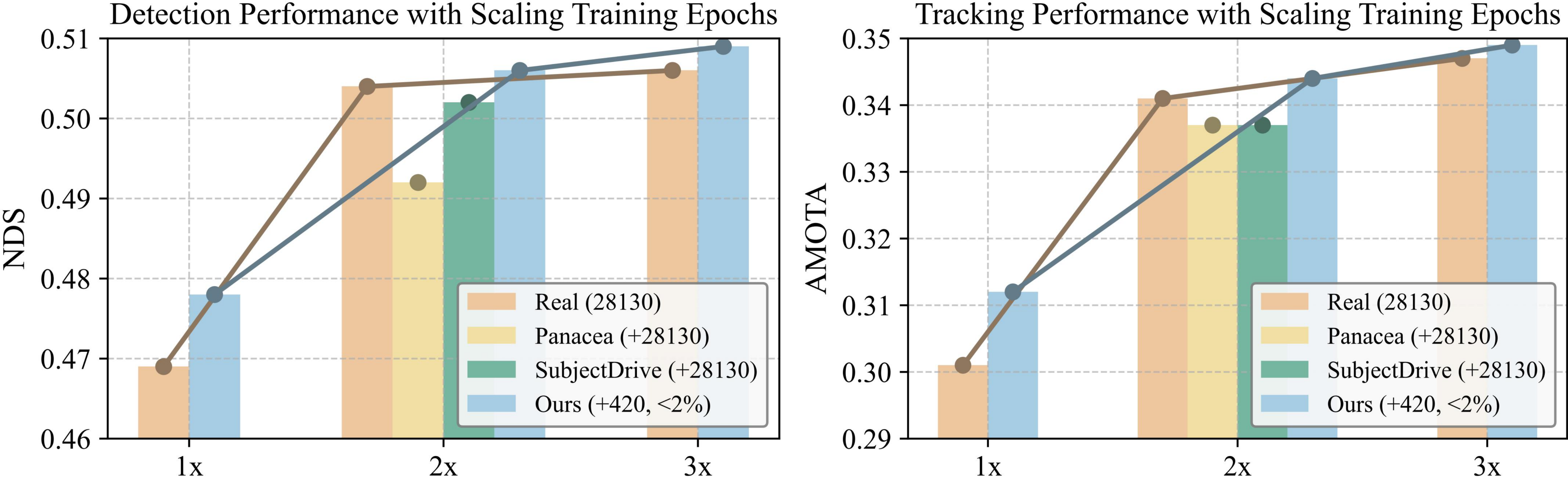 We conduct comprehensive experiments to show that Dream4Drive can effectively boost the performance of downstream perception models under various training epochs.